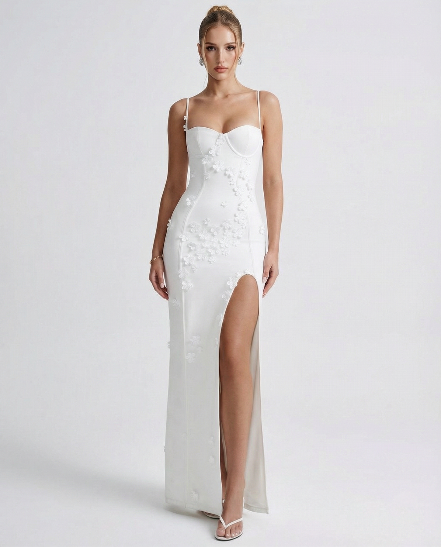 Soft, sculpting, and low-key iconic. The Charlotte Luna Slit Maxi is made to hug your curves in all the right places, with delicate floral appliqués that catch the light as you move. The corset-inspired bodice gives a snatched silhouette, while the thigh-high slit adds just enough drama. Think romantic energy, main-character confidence, and effortless elegance — all in one look.