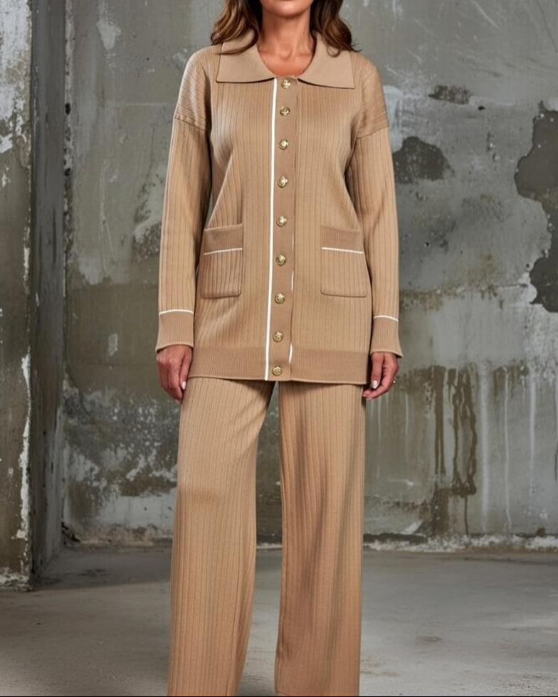 Relaxed elegance meets everyday polish in this softly structured knit set, designed to look refined while feeling completely effortless. Subtle ribbed texture, contrast piping, and gold-tone buttons create a clean, elevated finish that works beautifully for both at-home days and styled outings. The Mary Signature Set™ is the kind of outfit you’ll reach for when you want to feel put-together without overthinking it.